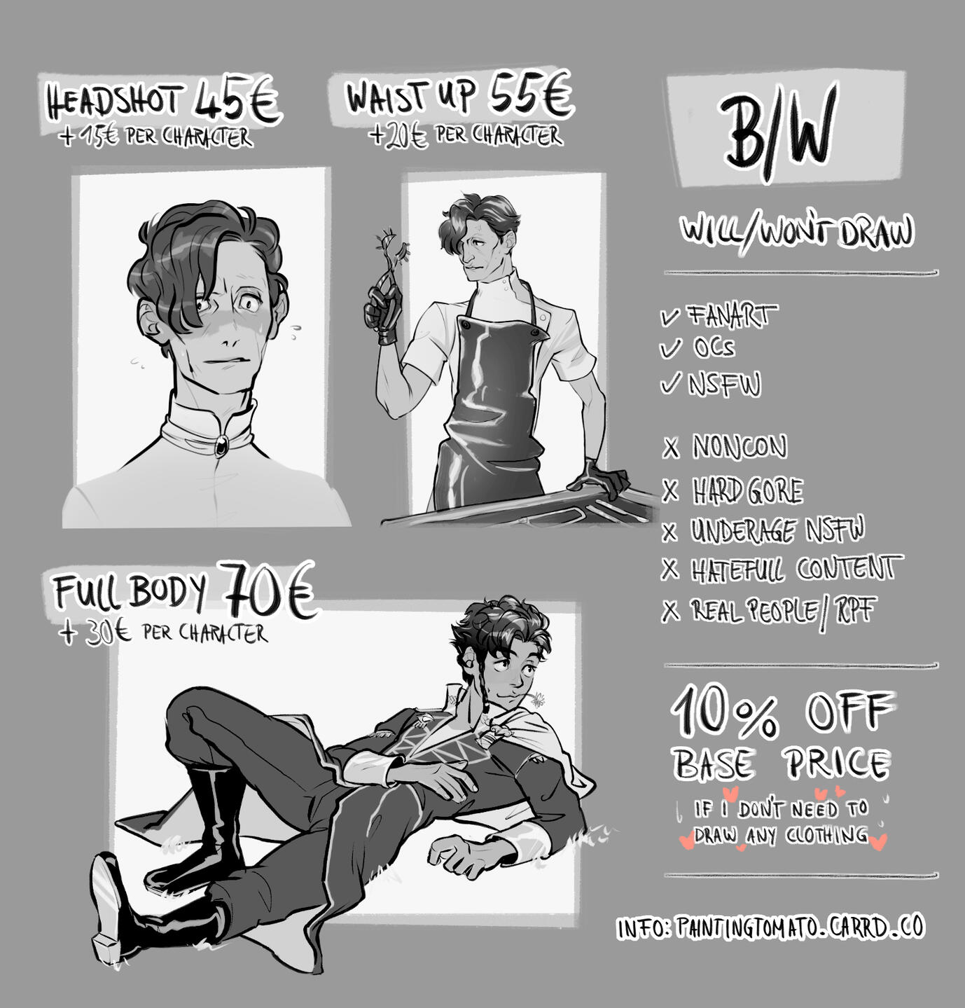 Please keep in mind that the time it will take me to finish your commission will vary depending on the scope of the project as well as general scheduling/life. As a rule, I’ll aim for 2-3 weeks (beginning with starting work on the sketch). If I’m aware it’s going to take longer for any reason, I will inform you right away.